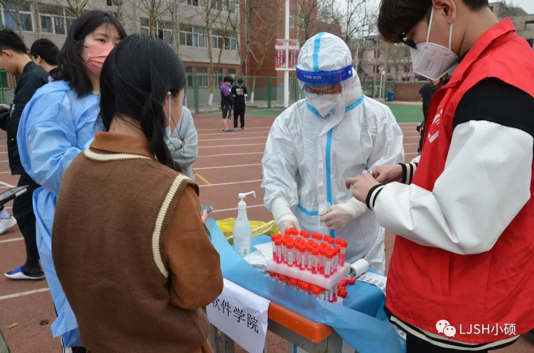 检测中,医护人员技术规范、防疫到位,领导老师亲临现场,统筹安排,社团干部志愿服务,保驾护航,师生齐心,共同战疫。