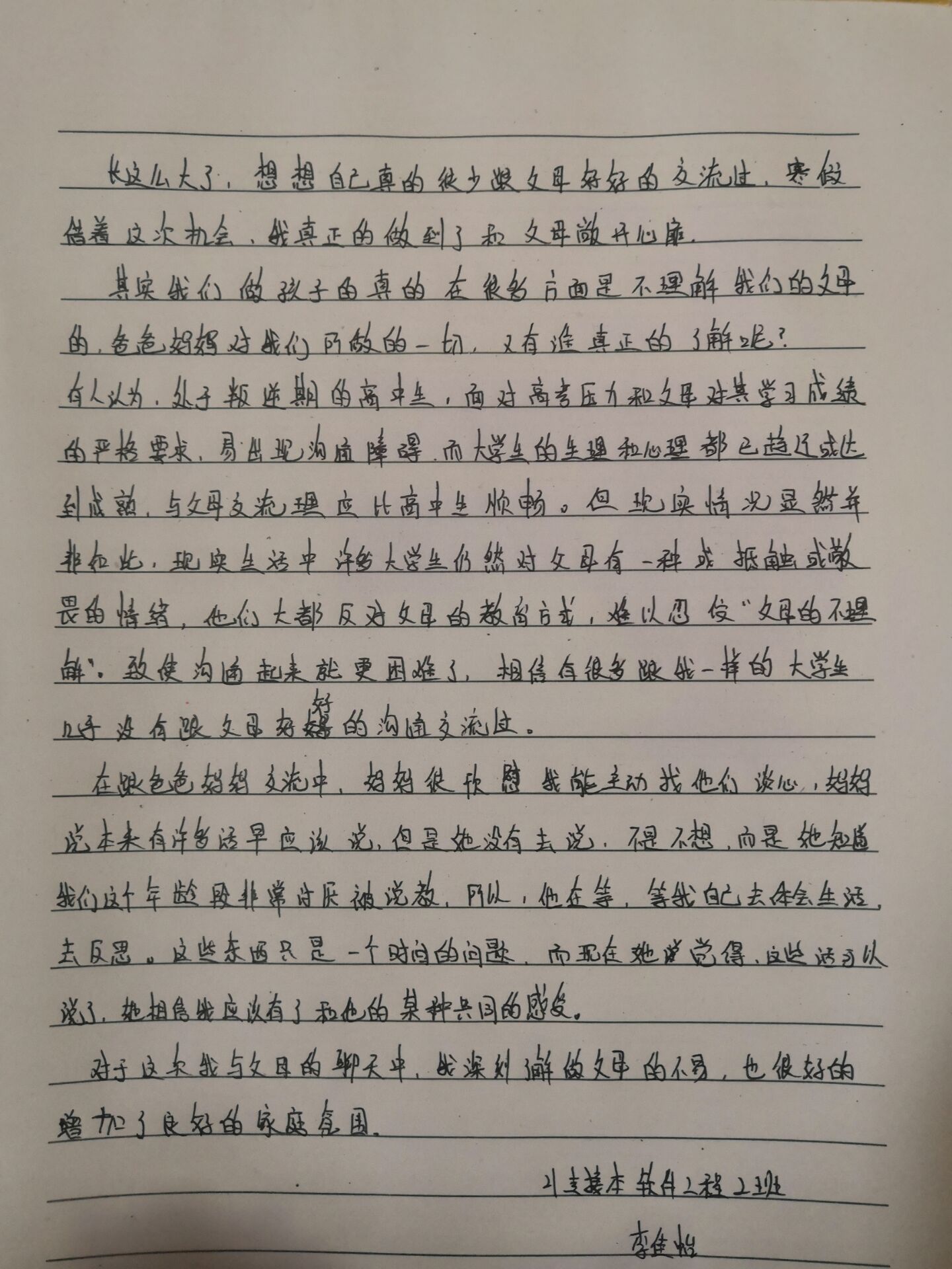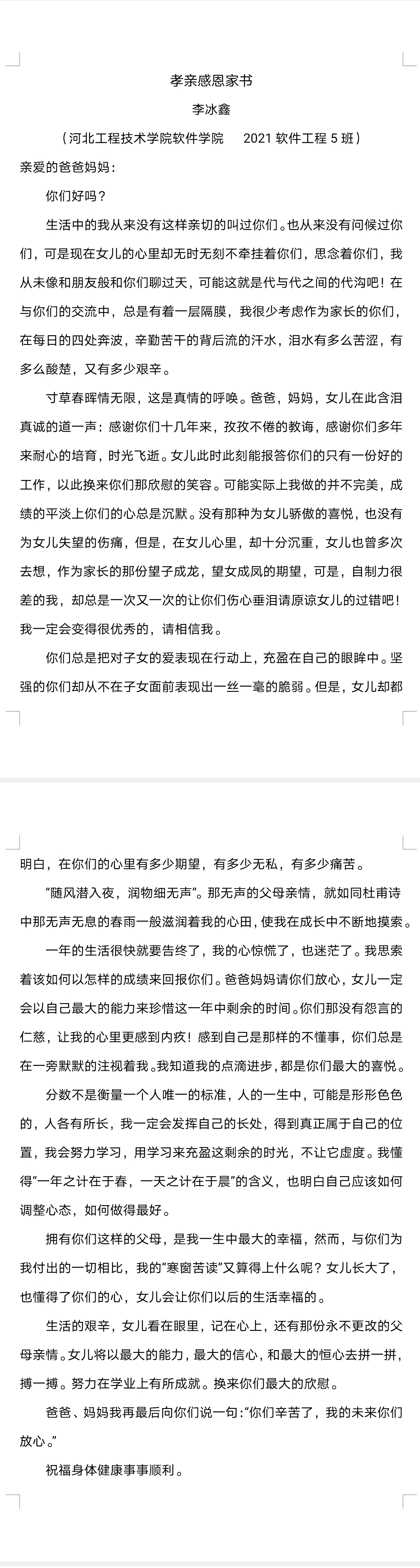 2.“长大以后才知道,和父母也可以成为最好的好朋友啊。可以无话不谈,可以分享有趣的事,可以互相敞开了心扉抱怨吐槽,可以永远当被保护的那一个。”——21网络安全1班 单宇祺