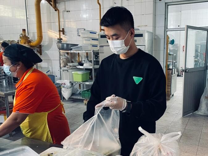 在志愿活动期间,李泽华同学主要负责组织三餐盛饭,到报餐处核实餐数以及与老师核实酒店隔离餐数,为静默期间的同学们提供他们的一日三餐。即使在迎新点没有他忙碌的身影,但在食堂后厨有他辛苦的付出。志愿者的工作很多时候是站在那里,可能一站就是两个小时重复着一样的动作,但是他没有任何怨言,他说:“我是一名退伍军人,退伍不褪色,爱国是一种精神,服务人民更是一种责任。我要在默默的付出中找到自身的价值,在大家的相互配合,合理分工之下,带着使命感完成任务”