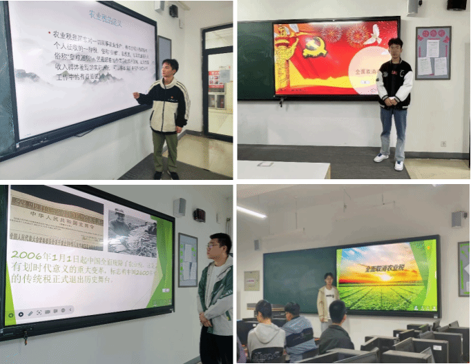 2022级电子商务1班的陈岑同学讲到为什么要取消农业税 :第一,2006年,中国经过二十多年的快速发展,农业税在全国税收中的占比已经很小了,取消并不会对国家运行造成大的影响;第二,几千年来,农业一直是国家税收的主要来源,到了现代社会,工商业取代农业成为税收的主要来源。国家不再需要从农业收取大量税收来支持国家运行和工业、商业体系建立;最后,我国人口绝大多数在农业上、在农村,要减小城乡差距,实现共同富裕,减少社会矛盾,必须要让农民这个群众富裕起来。电子商务2班的同学讲到全面取消农业税的艰难过程:改革并不是一帆风顺的,也有质疑的声音。对此,中央审时度势,从广大农民的根本利益出发,摒除杂音,坚定推进改革。到2005年底,全国已有28个省免征农业税,彻底取消农业税,让农民甩掉包袱轻装前行的时机已经成熟。同年12月,十届全国人大常委会第十九次会议决定,自2006年1月1日起废止《农业税条例》。原本计划5年完全取消农业税费的目标,在短短3年内就得以实现。