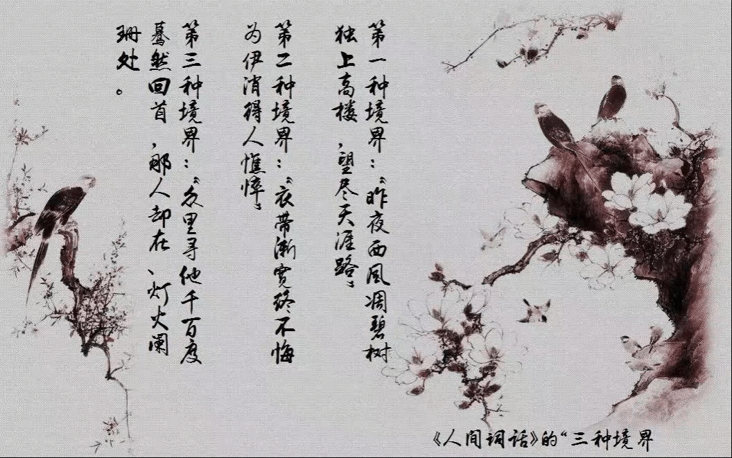 《人间词话》是一部被人们奉为古典文学批评里程碑式的作品。初读《人间词话》就让我沉浸于那精简却又华美的语句中,王国维不仅将其深厚的美学功底尽展其中,而且段段匠心独运。《人间词话》以小段形式呈现,甚至是只言片语,但其间不断流露出作者的睿智。诗文巨匠所创造的千古绝句与王国维的深刻见解穿过历史合二为一。那宛若天成的诗句加之王国维的唯美语句使《人间词话》散发出一股沁人心脾的幽香,平静了那些在喧嚣尘世中躁动的心灵,让那些被光明与黑暗折磨的筋疲力尽的人们找到了一处歇脚之地。