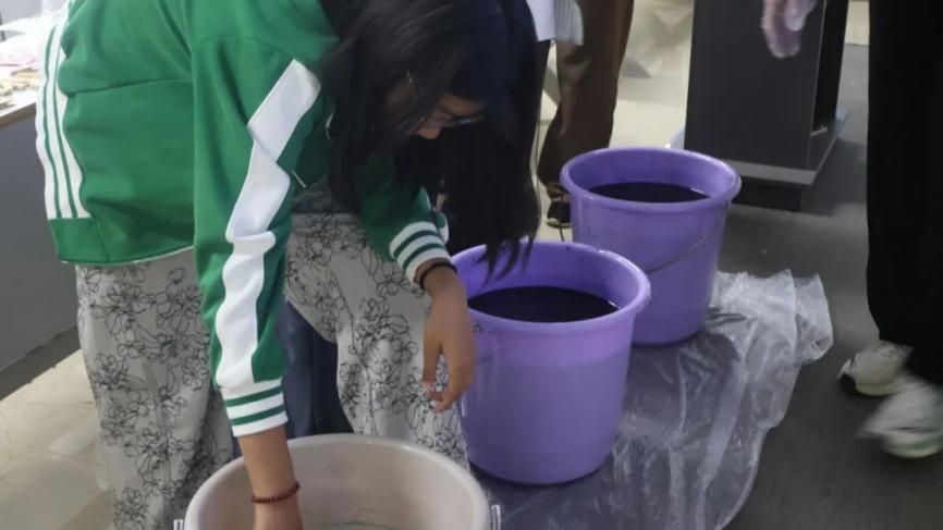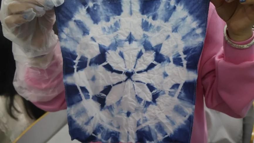他们将布料浸泡在事先准备好的染液中,屏息观察布料色彩变化,待其充分氧化后,将布料层层展开,一幅幅独具匠心的扎染作品跃然眼前,每件都蕴含着创作者的巧思。