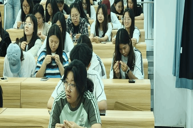 工作人员播放五彩绳编织视频,同学们从中感受编织魅力后,工作人员开始分发材料。面对五彩丝线,大家兴致勃勃却又略显茫然,有人打结不顺,有人配色纠结。很快,现场便出现了互帮互助的温馨场景:编织熟练的同学主动分享技巧、手把手指导,擅长配色的同学则帮着出谋划策、挑选丝线。待作品完成,同学们迫不及待地展示成果,有人将五彩绳系于手腕,有人把创意造型摆在桌上,拉着同伴从不同角度欣赏,现场赞叹声与设计灵感的交流声交织不断。每一件作品都凝聚着独特巧思,尽显传统工艺与创新创意的交融之美。