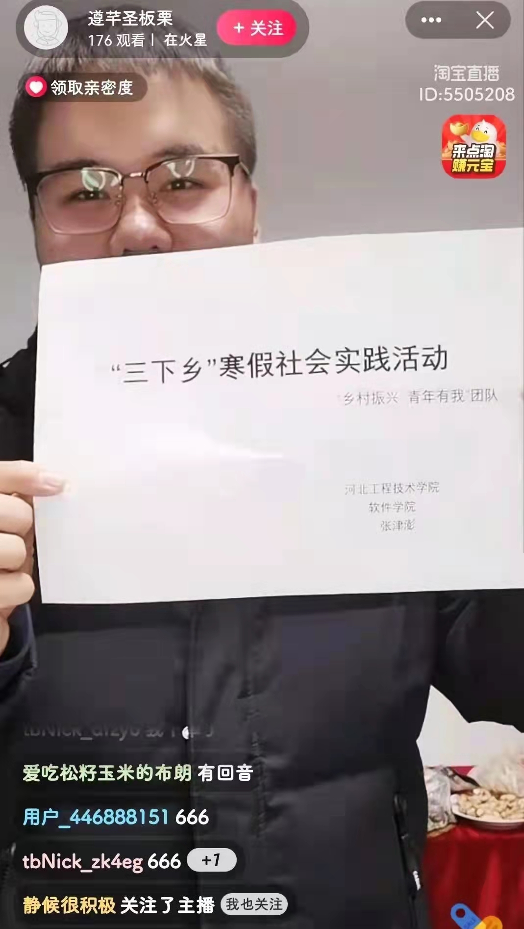 作为新时代的青年,应该承担起振兴乡村的重担,助力伟大复兴中国梦的实现。以张津澎同学为主的“冬日实践小分队”与经验丰富的辅导员白广平老师共同商榷,最后选择了遵化地区的燕山板栗,通过直播带货农产品,帮助乡村振兴。期间严格把控产品质量,保证产品卫生,制定详细带货计划。