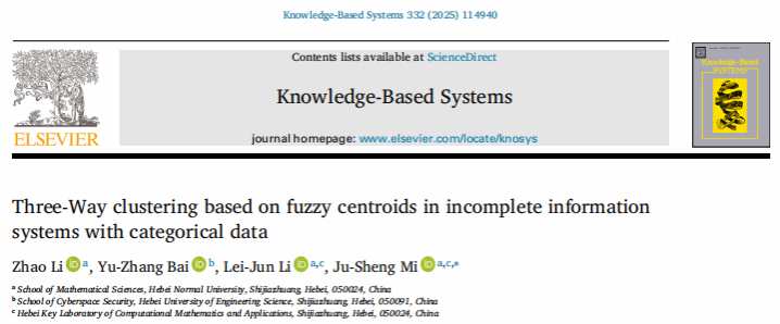 近日,beats365专任教师白宇璋以第二作者身份,在国际权威期刊《Knowledge-Based Systems》(ISSN:0950-7051)发表题为《Three-Way Clustering Based on Fuzzy Centroids in Incomplete Information Systems with Categorical Data》的学术论文。