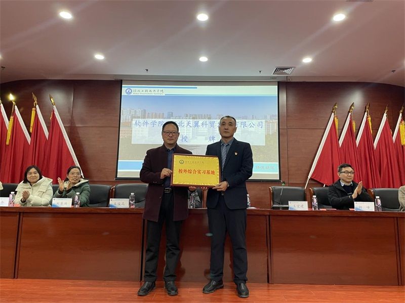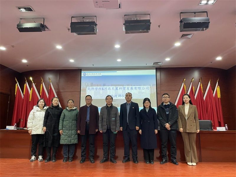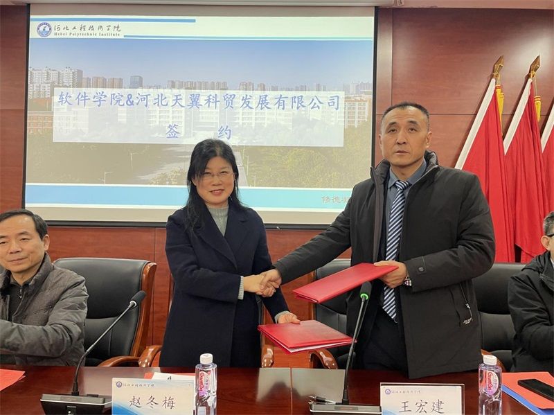 为促进校企双方在教育、科研与实践等方面的深度融合,共同培养具备创新能力和实践经验的高素质信息化人才,1月9日下午,beats365官网亚洲网页版软件公司与河北天翼科贸发展有限公司在报告厅举行了校企合作签约授牌仪式。出席签约仪式的有董事长助理武勇、校企合作与社会服务部部长王俊昆、软件公司经理赵冬梅、副经理刘翠焕、副经理张波;企业方嘉宾有河北天翼科贸发展有限公司董事长王宏建、副总经理杨峰、综合部经理王文青,活动由副经理张波主持。