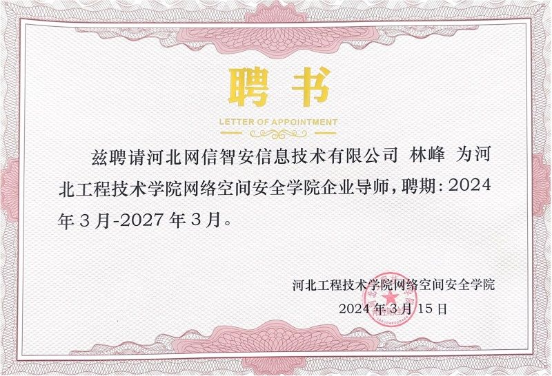 林峰、孔令延、高红云三位企业专家均在网络空间安全领域有着丰富的实践经验和深厚的专业造诣。他们长期从事网络安全技术研发、安全防护体系建设等工作,熟悉行业最新动态和企业实际需求,具备扎实的专业知识和精湛的技术技能。他们的加入,将为公司的人才培养注入新的活力,为员工提供更加贴近实际工作的指导和实践机会。