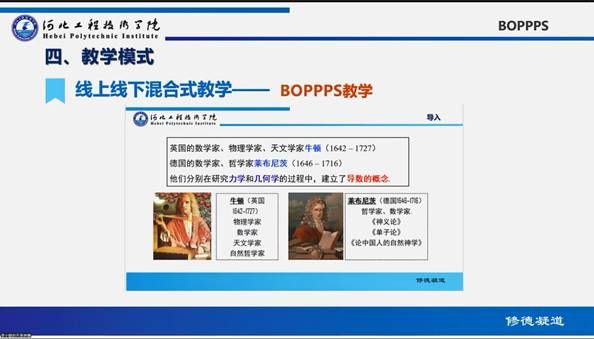 再次,进行课程思政汇报与分享,创新创业教研室胡晓微、通识教研室赵晓辉、张倩、吕倩如四位老师依次对《创新创业》、《高等数学》、《大学英语1》及《高等数学》课程从教学内容、教学组织、教学过程及课程思政元素、课程思政内容设计及方法等方面进行了“课程思政”讲课分享。