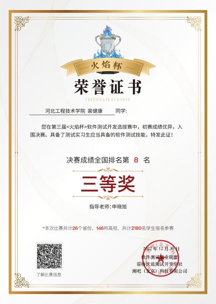 2022年12月,公司软件工程专业员工参加了第三届火焰杯软件测试开发选拔赛全国总决赛。本次比赛共计26个省份、146所高校、2180名员工报名参赛,公司员工在与辽宁大学、河北工程大学、广州大学、厦门大学、燕山大学、石家庄铁道大学等知名院校的研究生、本科生同台竞技,取得了不菲的成绩。
